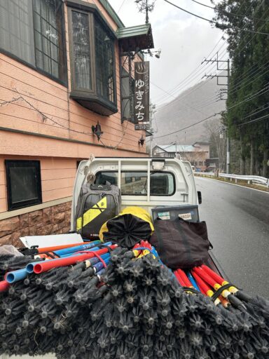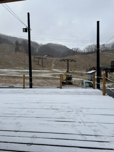 雪の知らせ!戸倉に準備に上がってきましたが、朝は雪が舞い始める中での作業でした。