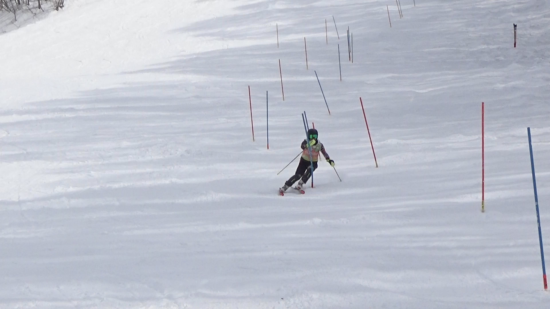 だいぶ下地ができてきた感じの上に、少し柔らかいですが、GSでも4本目あたりから下地の氷が出てくる感じです。SLに関しては2本滑走後のコース整備で氷が出てきます。